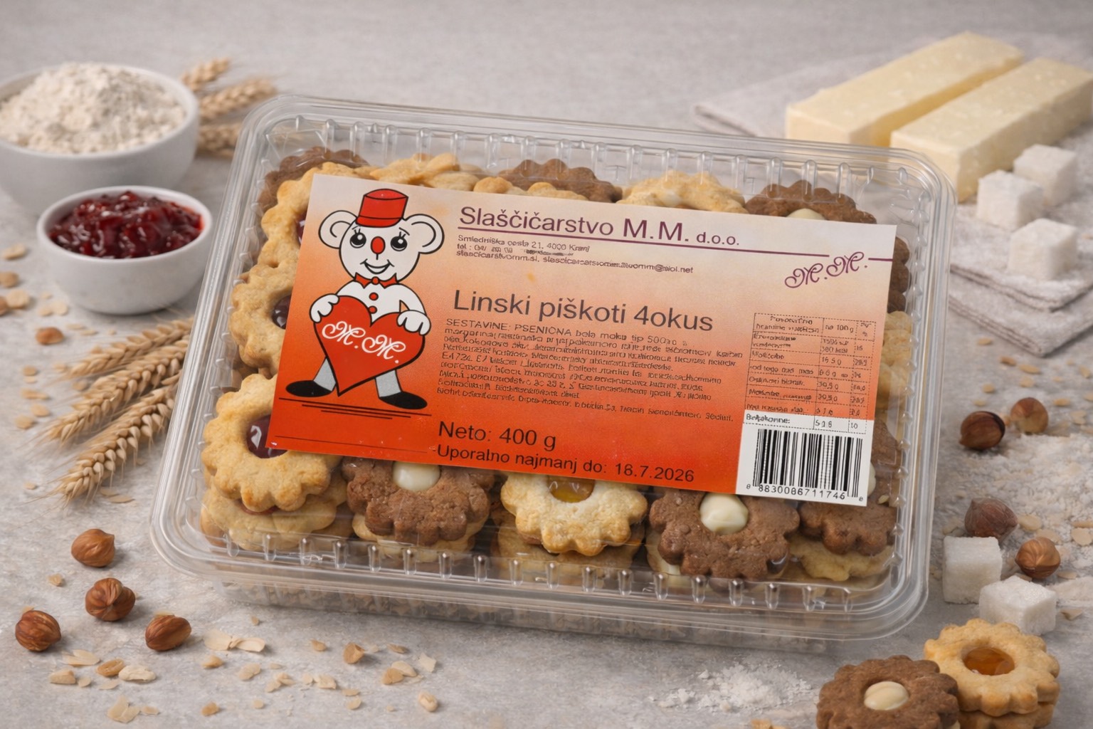 Nežno hrustljavi piškoti, polni bogatih okusov in prijetnih presenečenj. Polnjeni so s štirimi skrbno izbranimi nadevi – belo čokolado, lešnikovo kremo, ribezovo in marelično marmelado – ki ustvarjajo popolno harmonijo sladkih in sadnih not. Vsak grižljaj prinaša novo razvajanje in košček domače topline.